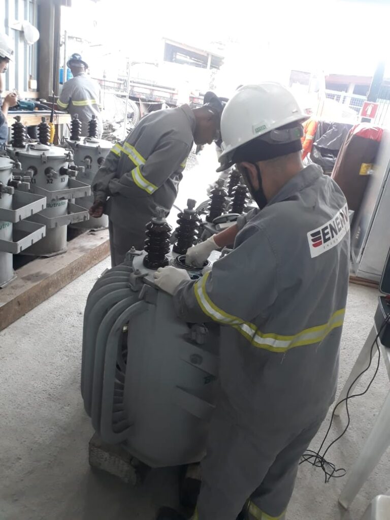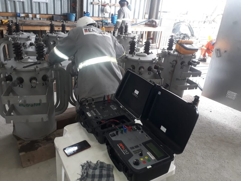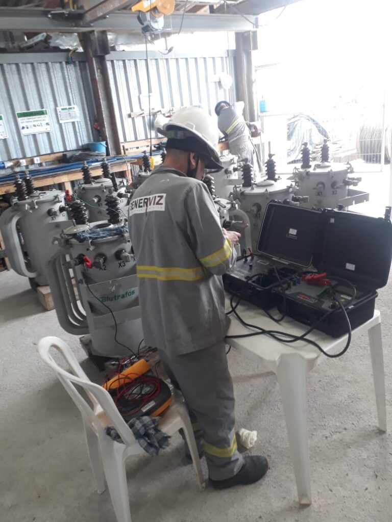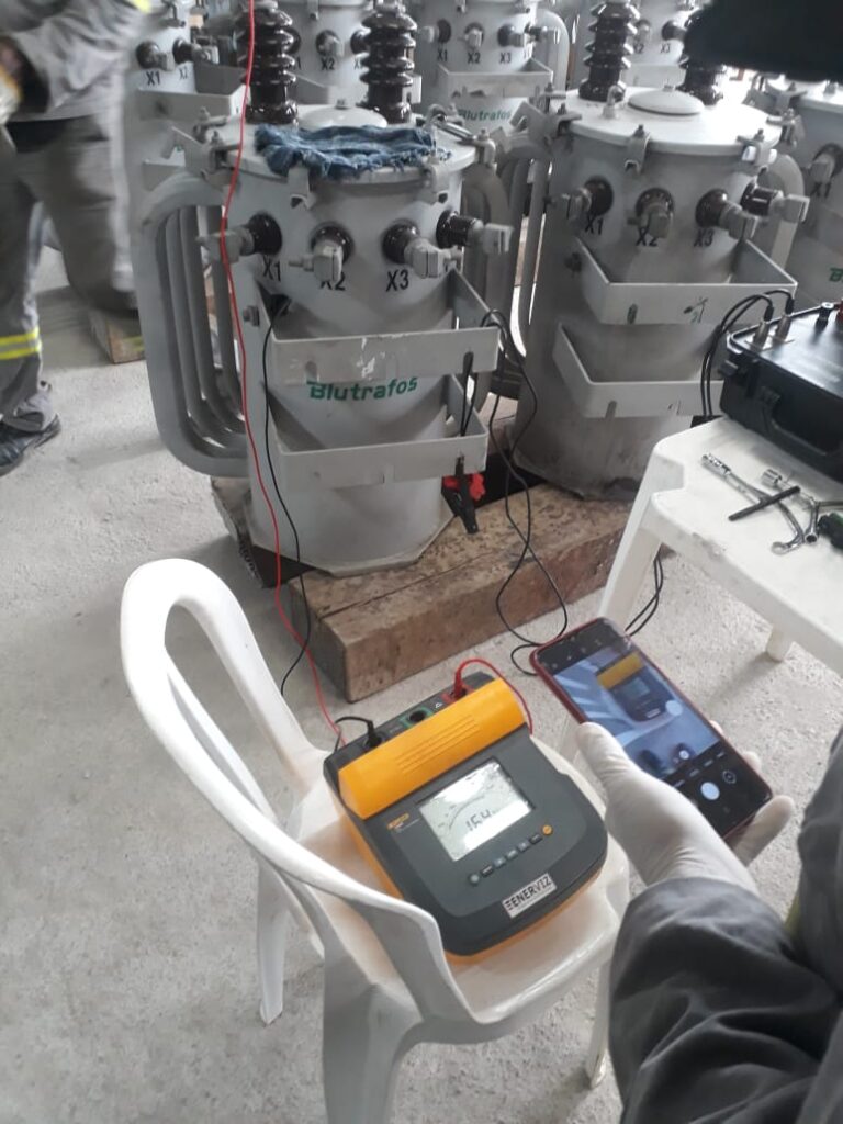 Imagens de teste de TAF (teste de aceitação em fábrica) em transformadores de potência, realizadas pela equipe da Enerviz seguindo normas técnicas e de segurança